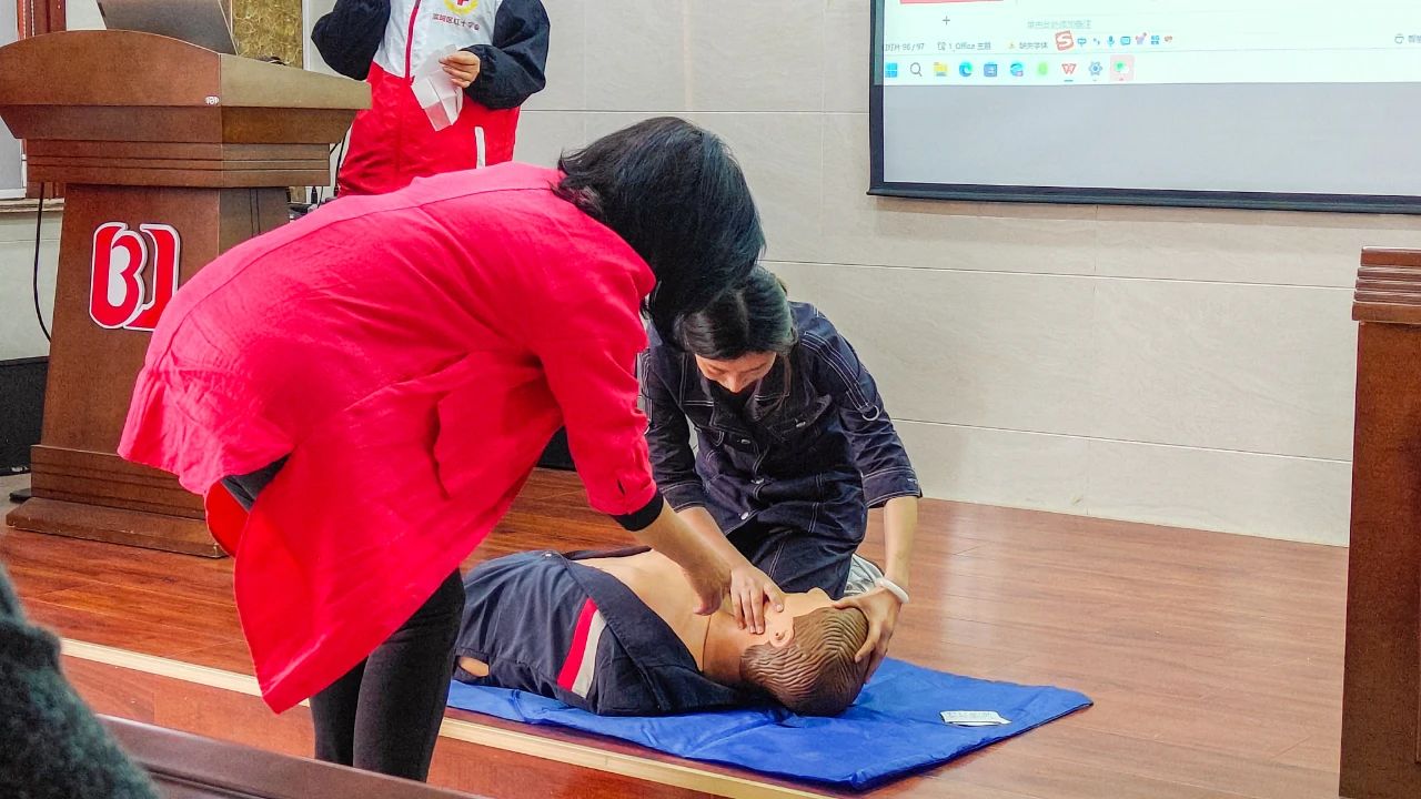 在培訓活動中,紅十字會的老師圍繞心肺復蘇術、創傷包扎等常見實用急救技能進行深度講解,并結合典型案例,用通俗易懂的語言解析急救“黃金4分鐘”的關鍵意義。“大家一定要保證手臂垂直,按壓深度5厘米,頻率100-120次/分鐘等關鍵要點,確保急救操作規范性。”培訓現場,老師一邊從判斷現場安全到實施急救措施的完整流程進行生動演示,一邊指導學員規范動作要領。